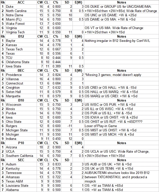 Fantastic stuff as always! Working my way through it now. 1 quick question - on the Championship Profile chart under Title, I'm assuming B=both, R=regular season, and T=tournament? If that's the case, I believe HOU should be a B as they won both the regular season and AAC tourney if I'm not mistaken? Not that this changes anything, as it's not a disqualifier and doesn't alter the fact that they fell in seed compared to last year (though I do think they may be underseeded based on all the advanced metric rankings .. but may just be overperforming without 2 star/key players). Just thought I would point it out.